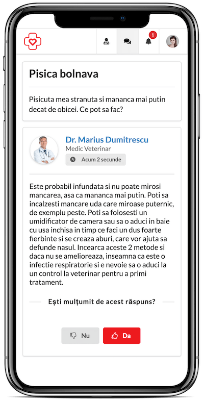 Ai acces la un număr mare de veterinari autorizați. Pentru fiecare veterinar sunt prezentate informații profesionale precum studii, experiență, dar și calificative din partea altor utilizatori.